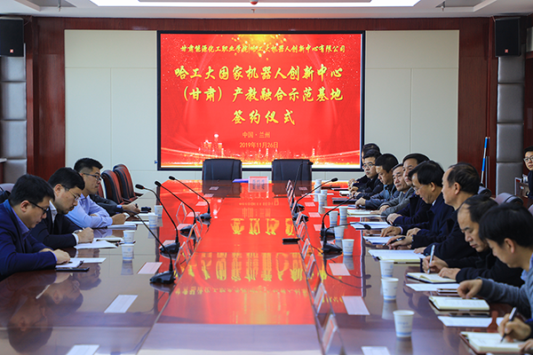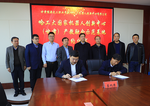 11月26日,哈工大国家机器人创新中心(甘肃)产教融合示范基地签约仪式在我院举行。兰州新区职教园区管委会副主任朱廷珺应邀参加,学院院长吴兰州致欢迎词,副院长王晖主持签约仪式。